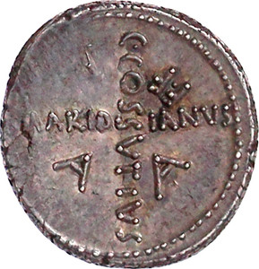 Denar 44 v. Chr. Münzbeamter C. Cossutius Maridianus. CAESAR PARENS PATRIAE. Verschleierer Kopf Caesars r. zwischen Apex und Lituus/C.COSSVTIVS und MARID-IANVS ins Kreuz gestellt, in den Winkeln A-A-A-F.F. 3,61 g.