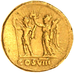 Aureus 77/78. Belorb. Kopf l./COS VIII. Vespasian und Victoria stehen l. 7,17 g.