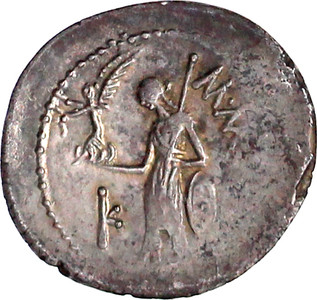 Denar, Januar/Februar 44 v. Chr. Münzbeamter M. Mettius. CAESAR IMP. Belorb. Büste Gaius Julius Caesar r., links Lituus und Simpulum/M METTIVS K. Venus Victrix steht l. 3,54 g.