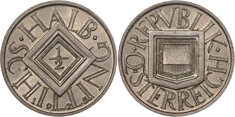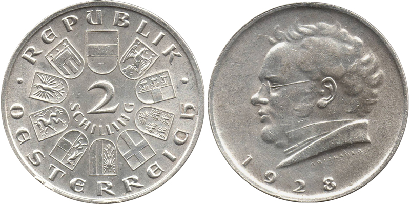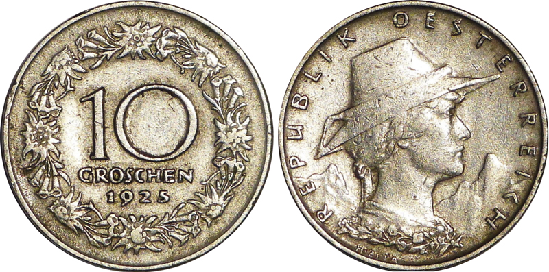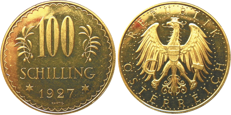 Die Ausgabe des „Doppelschillings“ erfolgte erst 1928 – als Gedenkmünze mit jährlich wechselnden Motiven. Mit Gesetz vom 20. Dezember 1924 wurde die Währungsreform dann konsequent zum Abschluss gebracht. Ab Neujahr 1925 war der Schilling zu 100 Groschen offizielles Zahlungsmittel. Das Wechselverhältnis zur Papierkrone wurde mit 1:10.000 festgelegt. Der Goldwert der neuen Währung entsprach dem Dollar-Stabilisierungskurs der Notenbank vom 18. Mai 1923. Für Scheidemünzen aus Silber und unedlem Metall galten staatliche Prägequoten und Annahmebeschränkungen. Aus dem Gesetzestext: „Die Bundesregierung wird Bundesgoldmünzen zu 100 und 25 Schillingen auf Rechnung des Bundes ausprägen. Hierbei entfallen auf einen Schilling 0,21172086 Gramm feinen Goldes. (…) Den Bundesgoldmünzen kommt unbeschränkte Zahlkraft für alle Zahlungen zu, die in Schillingen geleistet werden können.“ (5) Gegen Goldabgabe konnten die Münzen auch auf Privatrechnung geprägt werden. Zwischen 1926 und 1934 wurden so etwa 400.000 Münzen zu 100 Schilling und eine Million zu 25 Schilling geprägt. Der Begriff „Alpendollar“ entstand.