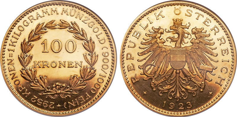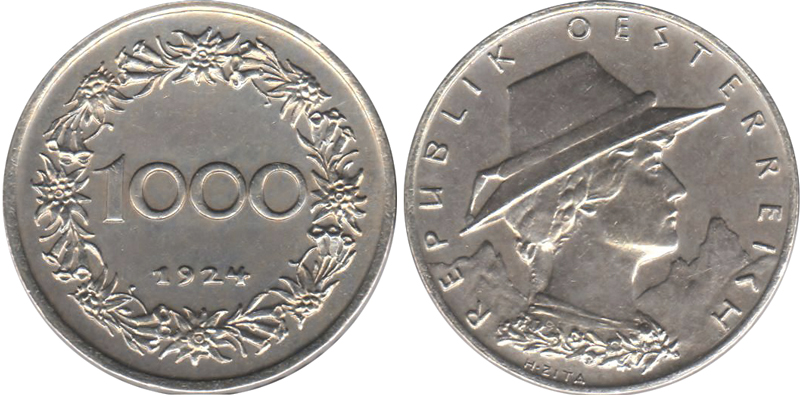 Die Abkehr von der Krone verlief jedoch schleppend. Durch Bundesgesetz vom 19. Juli 1923 wurde die Regierung zunächst ermächtigt, unedle Münzen im Wert von 100, 200 und 1.000 Papierkronen auszugeben. Mit dem Kleingeld sollten Banknoten geringen Wertes abgelöst werden. Bis Jahresende kam es jedoch lediglich zur Ausgabe einer Bronzemünze zu 100 Kronen. Parallel dazu wurden Goldmünzen zu 20 und 100 Kronen geprägt, die angesichts der geringen Stückzahl aber vor allem symbolische Bedeutung hatten. In Gewicht und Legierung entsprachen sie den Münzen des Kaiserreichs. Nur die Gestaltung war verändert worden. In einem weiteren Gesetz vom 21. Dezember 1923 tauchte erstmals der Begriff „Schilling“ auf, der anfangs nur als Nominal der Silbermünzen mit hohen Wertbezeichnungen gedacht war: Eine Münze im Nennwert von 5.000 Kronen mit Bezeichnung Halbschilling, eine Münze im Nennwert von 10.000 Kronen mit der Bezeichnung Schilling und eine Münze im Nennwert von 20.000 Kronen mit der Bezeichnung Doppelschilling. Als im Jahr 1924 diese und weitere Kleingeld-Münzen geprägt wurden, kommentierte die „Reichspost“ begeistert: „Sehr hübsch sind die 1.000-Kronen-Nickelmünzen, einen schönen Dirndlkopf in Alpentracht vor einer fein angedeuteten Berglandschaft, auf der anderen Seite einen Kranz Edelweiß und Enzian in meisterhafter Medaillierung zeigend. Der Schilling (10.000 Kronen) ist ein wahres Prachtstück. Ein zarter Lorbeerzweig umgrünt das Wappenschild, die Rückseite zeigt das auch in einer der letzten Briefmarkenausgaben verwendete Wiener Parlamentsmotiv mit der Pallas Athene.“(4)