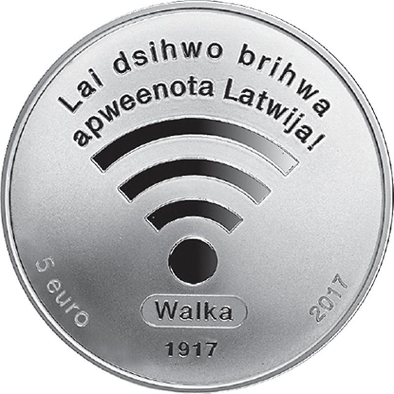 Das interessante Design der Nominalseite zeigt ein Wi-Fi-Symbol und trägt die Beischrift "Lang lebe das freie und geeinte Lettland!". Auf der Rückseite sieht man einen konzentrisch angeordneten Auszug aus dem Aufruf "An alle Letten!" des Nationalrates. Der Anfang lautet in etwa auf Deutsch: "Der Klang der Befreiung wurde erhört: wir verlangen das Selbstbestimmungsrecht aller Nationen!" Die erste Sitzung des lettischen provisorischen Nationalrates war ein bedeutender Schritt auf dem langen Weg hin zu einem souveränen lettischen Staat, der heute Mitglied der Europäischen Union und der Euro-Zone ist.