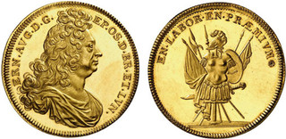 Numismatische Höhepunkte gibt es viele, so zum Beispiel einen Pfaffenfeind-Goldgulden von 1622 aus Lippstadt in gutem sehr schön (Nr. 2076, Taxe: 15 000 Euro), einen Reichstaler von 1702 in fast Stempelglanz mit der Darstellung des berühmten physikalischen Experiments Ottos von Guericke (Nr. 2127, Taxe: 10 000 Euro), einen doppelten Reichstaler, geprägt in Zellerfeld 1641 auf den Tod Georgs von Braunschweig-Calenberg-Hannover (Nr. 2306, Taxe: 20 000 Euro) oder die wunderbare, perfekt erhaltene Goldmedaille zu 50 Dukaten auf die unglückliche Wilhelmine Amalie.