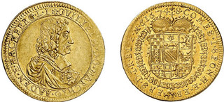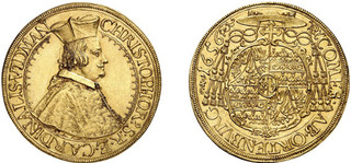 Auch bei den Standesfürsten gibt es Raritäten. Wir nennen den fünffachen Dukaten von Franz von Dietrichstein, Erzbischof von Olmütz (Nr. 6400, Taxe: 20 000 Euro) und den fünffachen Dukaten von Christoph Widmann, Kardinal von Ortenburg, geprägt 1656 in St. Veit (Nr. 6419, Taxe: 20 000 Euro).