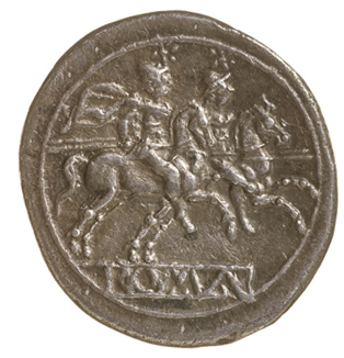 Das kriegerische Selbstverständnis und die militärische Macht der Römer ist den frühen römischen Münzen anzusehen: Roma hat als Stadtgöttin zwar langes Haar und Ohrringe, doch trägt sie einen Helm mit Flügeln, so dass ihr kämpferischer Charakter eindeutig ist. Das gleiche gilt für die Dioskuren: Die Zwillinge Castor und Pollux waren Söhne des Jupiter und halfen den Römern in Schlachten. Auf dem Denar sind sie reitend zu sehen mit Lanzen in den Händen und Helmen auf dem Kopf. Die Sterne über den Köpfen verweisen auf das Sternbild der Dioskuren.