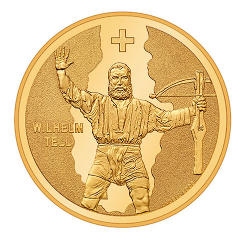 Auf Wilhelm Tell, den wohl bekanntesten Schweizer, emittierte die Schweiz eine 50-CHF-Münze (900er Gold, 11,29 g, 25 mm, 4.500 Ex. in PP).