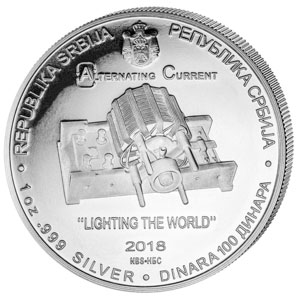 Av.: Teslas Wechselstromgenerator zwischen der Schrift ALTERNATING CURRENT / LIGHTING THE WORLD (Wechselstrom erleuchtet die Welt); Umschrift REPUBLIKA SRBIJA in lateinischen und kyrillischen Buchstaben, dazu die Angaben 1 oz .999 SILVER • DINARA 100 und die Nominalbezeichnung zusätzlich in kyrillischen Buchstaben.