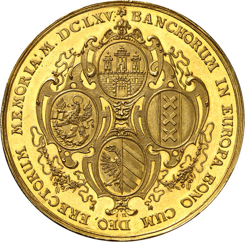 Und diese Hamburger Bank wurde im Jahr 1653 von der Stadtregierung offiziell mit der Aufgabe betraut, die Prägung der Portugalöser wieder aufzunehmen. Dabei handelte es sich um wertbeständige, schwere Goldmünzen im Gewicht von 10 Dukaten. Dieses Nominal hatte eine weit zurückreichende Tradition. In dieser Form hatte Portugal das aus Afrika importierte Gold nach Europa gebracht. Hamburg hatte Münzen nach Portugiesischem Vorbild mit dem eigenen Wappen geprägt. Und nun wurde auf ähnlich schweren Goldmünzen in barocker Pracht Hamburg als Stadt, Hafen und Zentrum des Handels gefeiert.