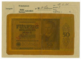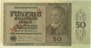 Nr. 598: Deutschland, 50 Billionen Mark 1924, 10. Februar. Diagonaler Aufdruck MUSTER. Originalbriefumschlag der Zentralnotenbank. Sehr selten. Kassenfrisch. Schätzung 1.250,-- €