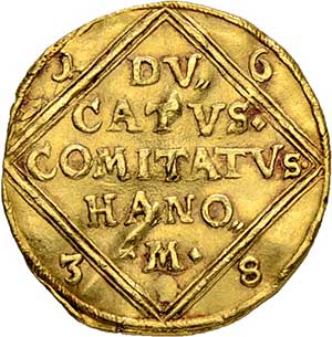 Und der äußerst seltene Dukat 1638 der Grafschaft Hanau-Münzenberg, Nummer 128, 22.000 Euro.