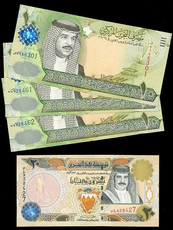 - Bahrain Monetary Agency, 20 dinar, 1973, serial number 838427, orange, Hamad bin Isa Al Khalifa at right, reverse, Mosque in Manama, also Central Bank of Bahrain, 10 dinars(3), 2006, 146301, 928461/462, green, Hamad bin Isa Al Khalifa at left, reverse, bridge, (Pick 24, 28, TBB B218, B304), uncirculated (4).