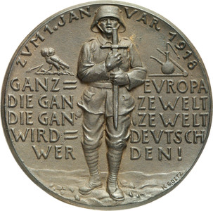 Seine nationalistische Haltung hat Karl Goetz in der Umschrift einer Medaille zum Jahr 1918 so zum Ausdruck gebracht: "GANZ EUROPA DIE GANZE WELT DIE GANZE WELT WIRD DEUTSCH WERDEN". Bildquelle: https://ikmk.smb.museum/object?id=18235088.
