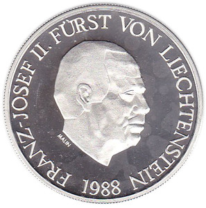 Liechtenstein, 10 Franken, 1988: Fürst Franz Josef II., Silber (.900), Gewicht 30 g, Durchmesser 37 mm, Quelle: de.numista.com