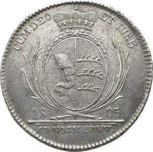 Dieser Halbtaler von 1805 bildet Friedrich von Württemberg als Kurfürst (Elector) und Reichsbannerträger ab. Bildquelle: CC BY-NC-SA @ Münzsammlung des Sparkassenverbands Baden-Württemberg.