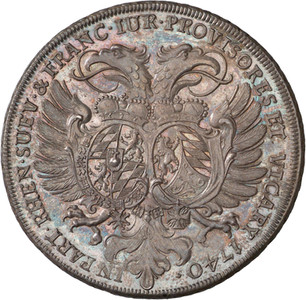 Mit dem Tode Kaiser Karls VI. kam es neben Sachsen auch in der Pfalz zur Ausprägung von Vikariatsmünzen, wie dieser Taler von 1740 zeigt. Die Kurfürsten der Pfalz und Bayern teilten sich in dieser Zeit ihr Amt als Reichsvikare. Bildquelle: https://ikmk.smb.museum/object?lang=de&id=18206331.