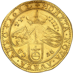 Friedrich von der Pfalz. 4 Dukaten 1612. Sehr selten. Minimale Bearbeitungsspur am Rand. Sehr schön bis vorzüglich. Taxe: 15.000 Euro. Künker 410 (23.9.2024), Nr. 111.