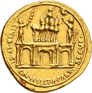 418 Augustus. Aureus 17 v. Chr., Colonia Patricia (?), auf den Rückerhalt der von den Parthern gestohlenen Feldzeichen. SP 7.500 €, Zuschlag 19.000 €