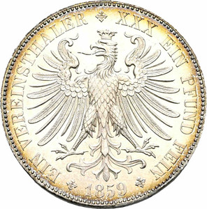 2305 Frankfurt, freie Stadt. Taler 1859. Fast Stempelglanz. Schätzpreis 100, Zuschlag 900 €
