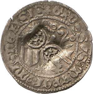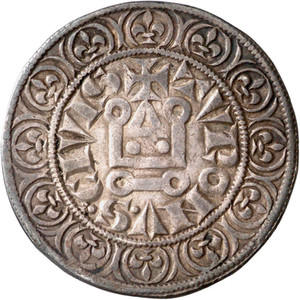 Königreich Frankreich, Philipp III. Gros tournois, 1270-1285, Bildquelle: https://ikmk.smb.museum/object?id=18205223. Eine Münzreform schuf 1266 in Frankreich eine handliche Münze, die 12 kleine ersetzte. Dieser nach dem Prägeort Tours benannte Gros tournois besaß Vorbildfunktion und verbreitete sich über die Grenzen Frankreichs und wurde an vielen Orten mit unterschiedlichen Bildern und Aufschriften nachgeprägt.