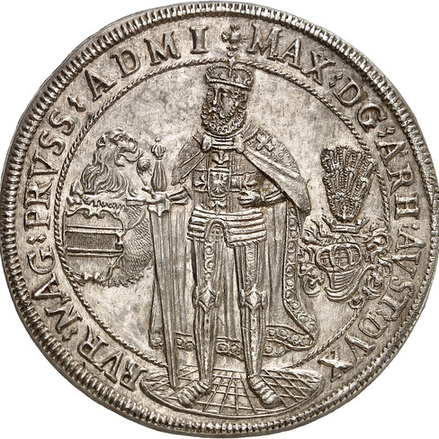 Sehen wir uns das an einem Beispiel an, das wir Ihnen bereits in unserem Vorbericht vorgestellt hatten: Es geht um den Taler von Maximilian I., seit 1590 Hochmeister des Deutschen Ordens und seit 1595 Regent von Oberösterreich. Tirol mit der Münzstätte Hall gehörte zu Oberösterreich, so dass die aktive Münzstätte auch diesen Taler prägte.