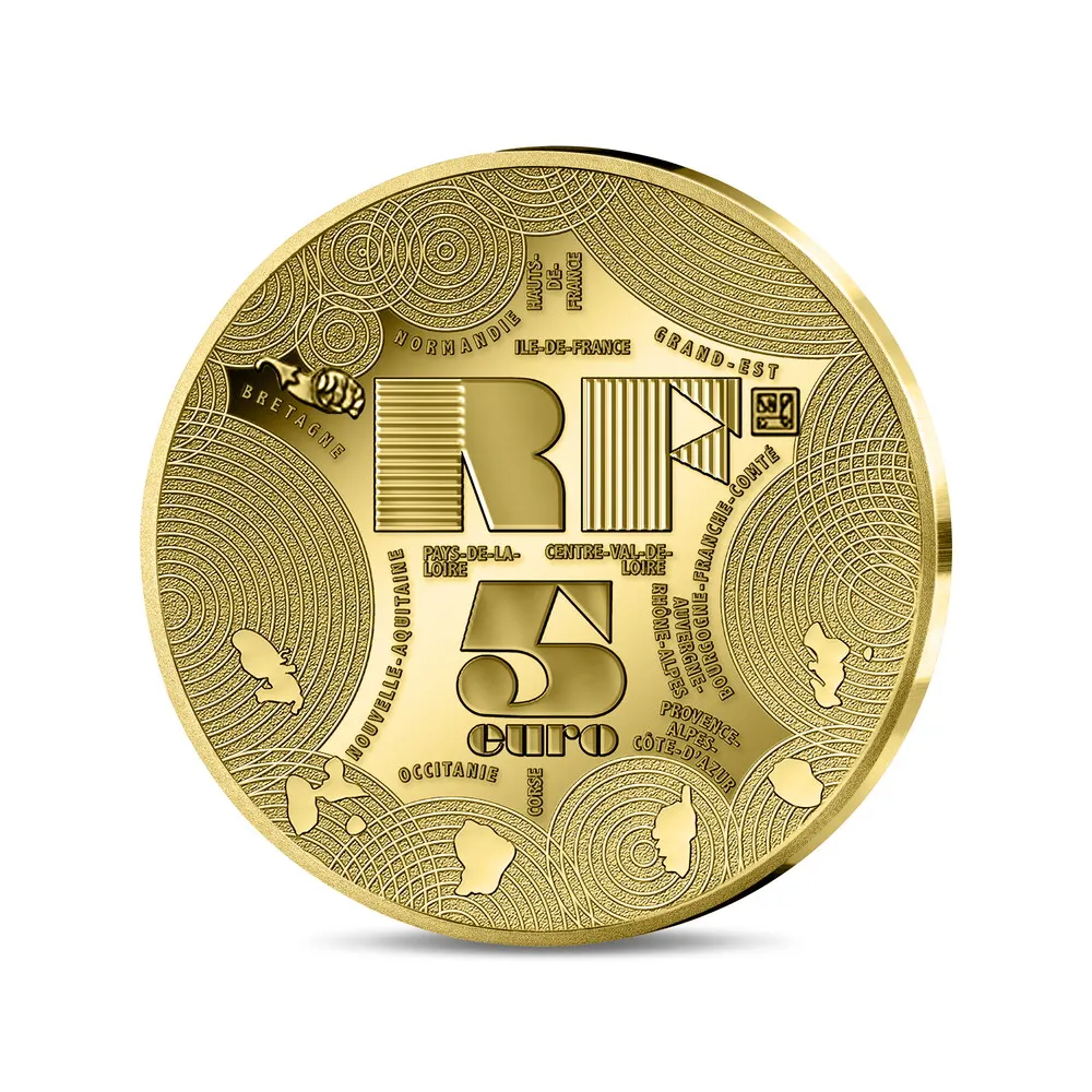Auf den motivgleichen Rückseiten der Münzen der Region Île-de-France findet sich im Zentrum der Pariser Eiffelturm, darunter der Eigang zur Metro, links davon ein Profil von Ludwig XIV. sowie ein allegorisches Element mit Bezug zum Sonnenkönig und rechts davon eine majestätische Hirschbüste, die für Wild, Wälder und Natur steht und drei Lilien aus dem Wappn der Region. Auf den Rückseiten der Münzen der Region Okzitanien sehen wir im Zentrum ein okzitanisches Kreuz, rechts davor das Porträt der Schriftstellerin und Revolutionärin Olympe de Gouges, darunter die Arena von Nimes, links davon den Kopf eines Steinbocks und diverse Berggipfel, die für die Pyrenäen stehen und ganz oben links eine Rakete, den Planeten Saturn und Sterne, die die Luft- und Raumfahrindustrie in der Region symbolisieren. Auf den Münzrückseiten der Region Grand Est erscheinen rechts das Straßburger Münster und ein Storch, als Symbol des Elsass, und links ein Porträt des ersten Frankenkönigs Chlodwig sowie die Kontur eines Weinblatts und eine Weintraube, die für den Weinanbau in der Champagne und im Elsass stehen. Von den Vorderseiten dieser Münzen haben allerdings nur die 5-€-Stücke einen Bezug zu den Regionen über eine entsprechende Kartendarstellung, während die 10-€- und die 500-€-Münzen vorderseitig einen Lorbeer- und einen Eichenzweig zeigen, die zusammen mit dem Wort EURO ein Eurozeichen bilden, dem die Nominalzahl „10“ bzw. „500“ dann vorangestellt ist.