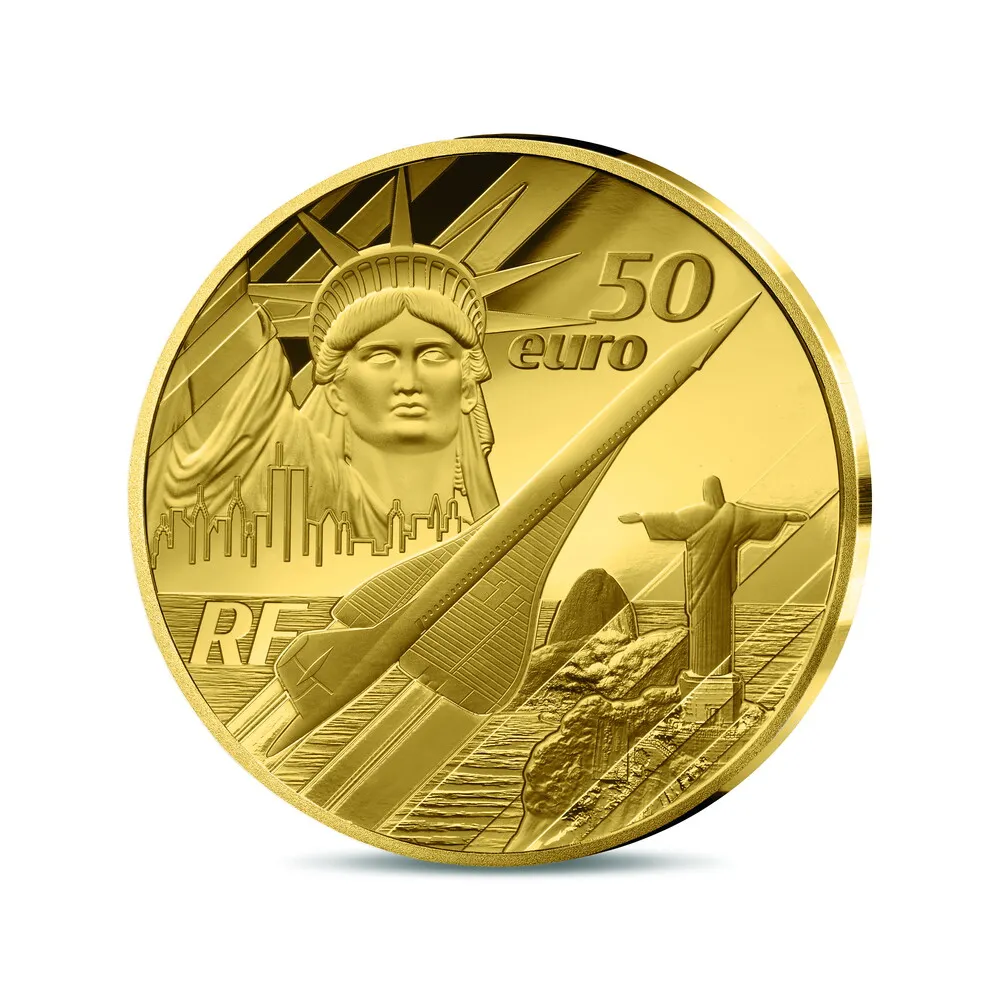 Mit Ausnahme der 10-€-Münze in 333er Silber sind alle Münzvorderseiten motivgleich und zeigen eine schräg in den Himmel aufsteigende Concorde vor der Skyline von Manhatten und dem Kopf der Freiheitsstatue im Hintergrund sowie dem brasilianischen Zuckerhut und der weltberühmten Christus-Statue von Rio de Janeiro im Vordergrund. Sie nennen das Staatskürzel RF und den jeweiligen Nominalwert. Auf den motivgleichen Rückseiten sehen wir eine Collage aus Concorde und Eiffelturm vor senkrechten parallelen Streifen und lesen Concorde 2026 / 50 ANS DE LA MISE EN SERVICE.