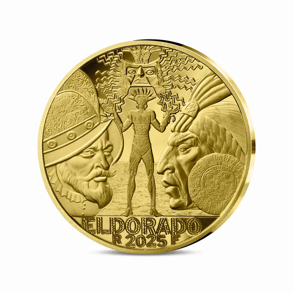 Im September 2025 setzte Frankreich die Serie „Die Säerin“ und die Reihe „Mythen vom Gold“ mit der Ausgabe von zwei Gold- und einer Silbermünze auf Eldorado fort. Unter den spanischen Konquistadoren des 16. Jahrhunderts kursierte die Legende von einem legendären Goldland (Dorado) im nördlichen Südamerika. Die Legende geht auf einen religiösen Brauch der Musica-Indianer in Guatavita (Kolumbien) zurück, der zufolge ihr Häuptling, der am ganzen Körper mit Goldstaub bedeckt war – „der Vergoldete“ (Eldorado) –, auf einen heiligen See hinausfuhr, um kostbare Schätze zu opfern und danach den Goldstaub in einem zeremoniellen Bad im See wieder abwusch. Eldorado und sein Gold waren es, was die Spanier bald überall in Südamerika suchten. Nun hatte der Eroberer Francisco Pizarro während seiner Expedition von 1532 den letzten Inkakönig Atahualpa gefangengenommen. Er erzwang, dass ihm beträchtliche Mengen des Inkagoldes ausgehändigt wurden. Anschließend ließ er Atahualpa ermorden. Eldorado wurde jedoch nie gefunden. Nach Eldorado suchten nicht allein die Spanier, sondern ebenso G. Hohermuth und Philipp von Hutten, die 1535 im Dienste der süddeutschen Welser standen und 1595 auch der englische Seefahrer Sir Walter Raleigh.