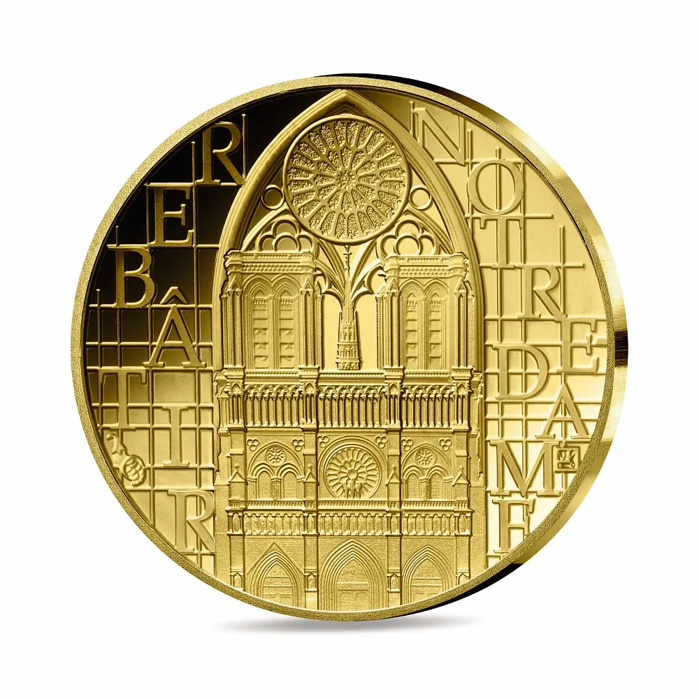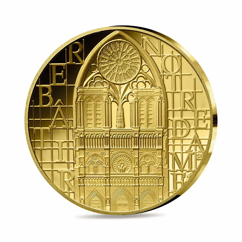 Die Münzvorderseiten zeigen alle das kathedralenförmige Kircheninnere mit dem neu reparierten Dachstuhl und nennen das Staatskürzel RF. Bei den runden Münzen wird das Kircheninnere noch von Handwerkern und Arbeitern in „Aktion“ umgeben. Auf den Rückseiten sehen wir die Außenfassade der Notre Dame in einem kathedralenartigen Ausschnitt. Dieser ist auf den runden Ausgaben noch von gerüstartigen Linien umgeben, innerhalb derer sich die Aufschrift REBATIR NOTRE DAME (Der Neuaufbau von Notre Dame) findet. Bei der 1-kg-Feingoldmünze wurde das Rosettenfenster an der Außenfassade der Kathedrale zusätzlich farbig emailliert. Übrigens, der Preis dieser 1-kg-Feingoldmünze beträgt laut Monnaie de Paris 155.000,– €.