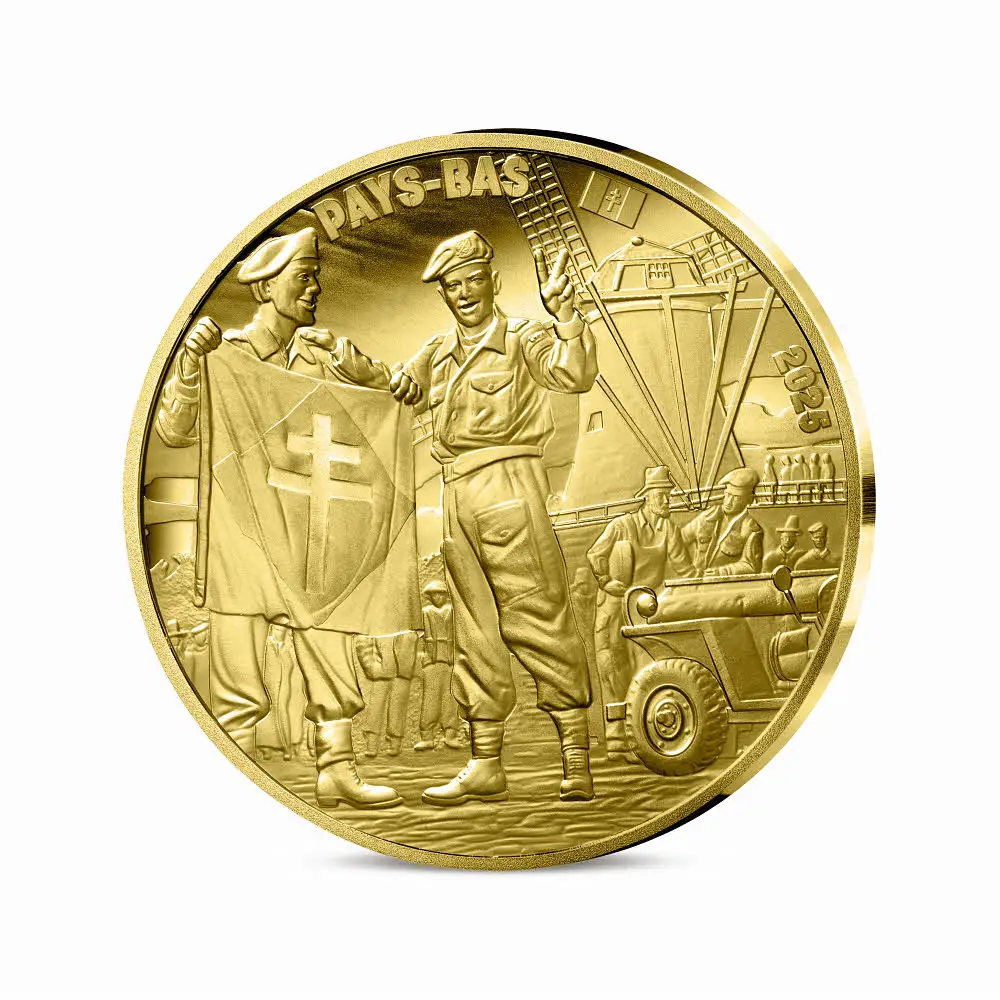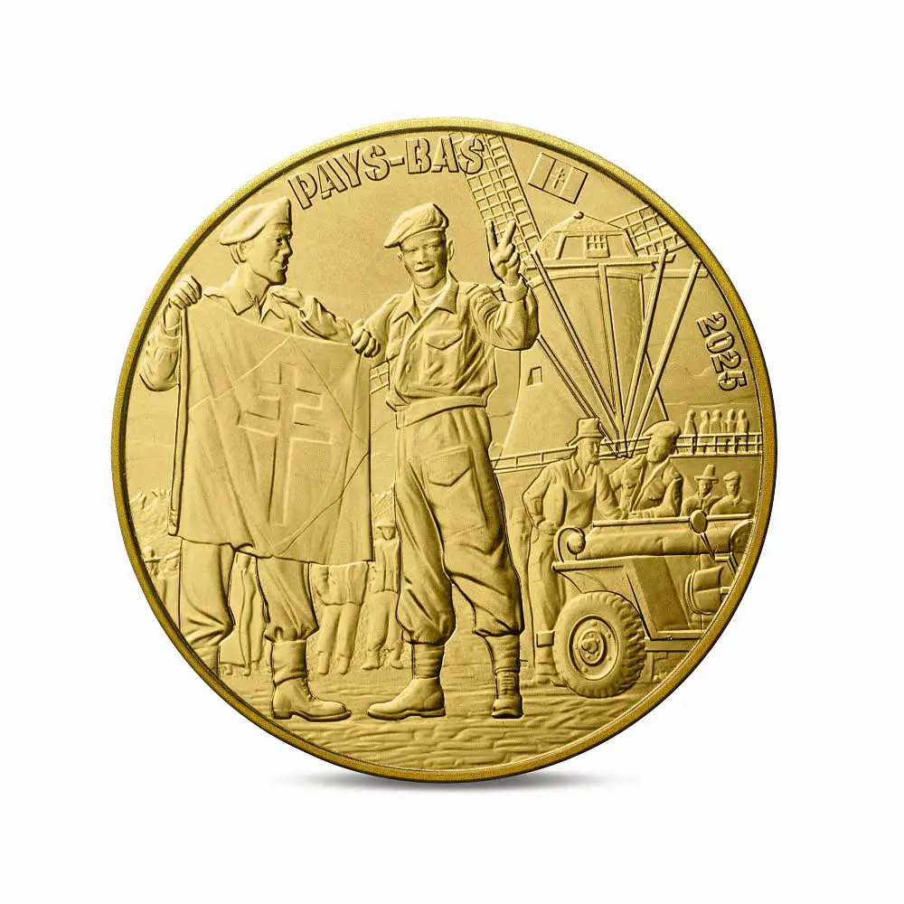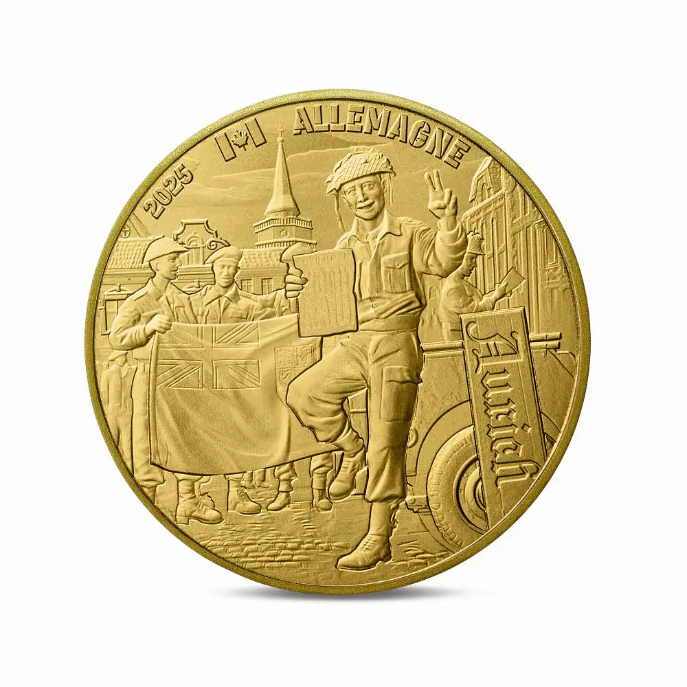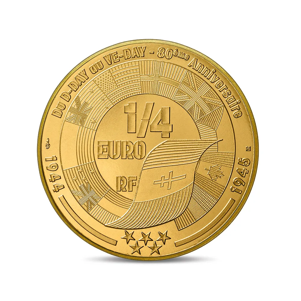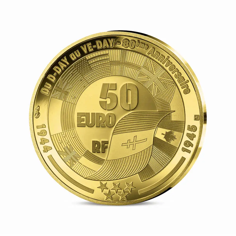 Nachdem die alliierten Streitkräfte am D-Day (6. Juni 1944) in der Normandie gelandet waren, begann der Kampf um die Befreiung West- und Mitteleuropas von Nazi-Deutschland. Ein Vorhaben, das dann noch viele Kämpfe, Tote und Verwundete kosten sollte, ehe die Deutsche Wehrmacht besiegt war, das Dritte Reich am 8. Mai 1945 bedingungslos kapitulierte und Europa inklusive Deutschland befreit war. Der Tag des Sieges in Europa wird auch als VE-Day (Victory in Europe Day) bezeichnet. Aus diesem Anlass emittierte Frankreich Ende April 2025 vier ¼-€-Münzen in Aluminium-Bronze, vier 10-€-Feinsilber-Münzen, zwei 50-€-Goldmünzen und eine 200-€-Goldmünze. Die jeweils vier Münzen sind einem französischen, einem britischen, einem kanadischen und einem US-amerikanischen Soldaten gewidmet. Die zwei 50-€-Goldstücke nur dem französischen und dem britischen Soldaten und das 200-€-Goldstück allein dem französischen Soldaten.