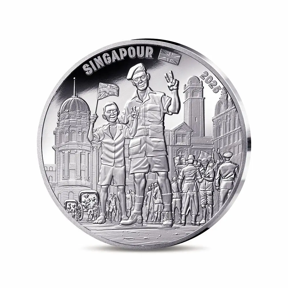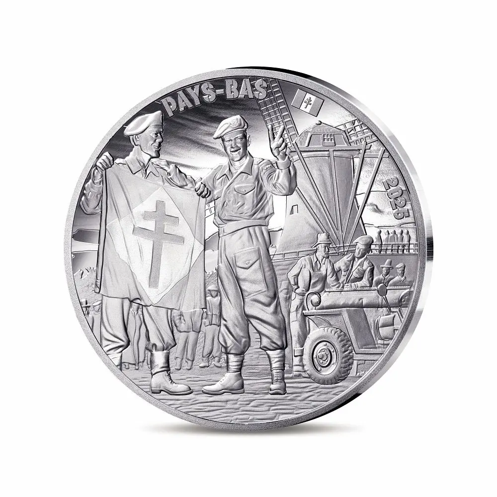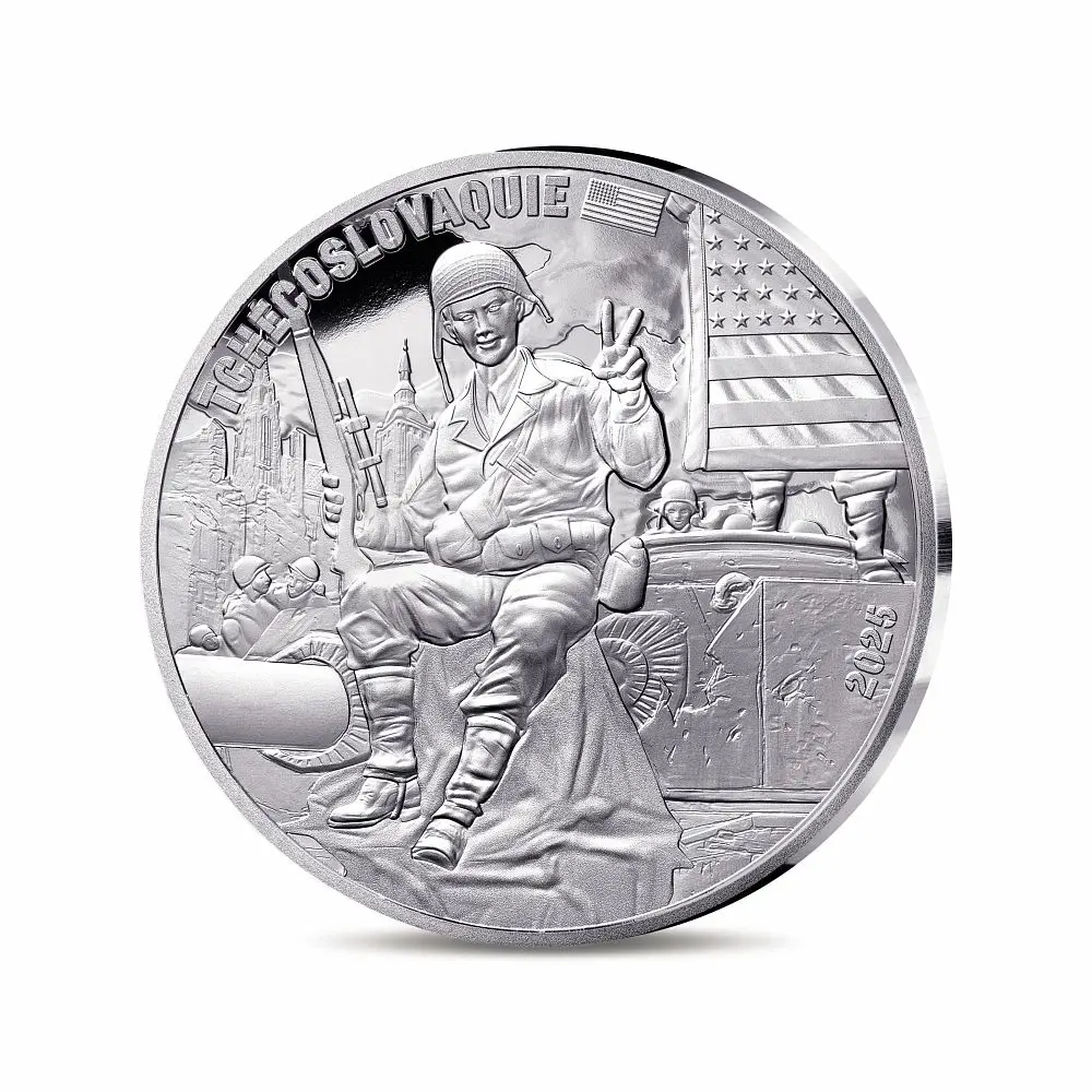 Die Rückseiten, die dem französischen Soldaten und seinen Kampfeinsätzen gewidmet sind, zeigen diesen mit Kameraden bei Kriegsende in den Niederlanden, mit Windmühle im Hintergrund und der Umschrift PAYS-BAS / 2025. Die Rückseiten, die des britischen Soldaten und seiner Einsätze gedenken, bilden diesen nebst einem Jungen aus Singapur ab, da er nach seinem Europa-Einsatz nach Singapur verpflichtet wurde, um dort die Japaner zu bekämpfen. Die Umschrift lautet SINGAPOUR / 2025. Auf den Rückseiten der Münzen, die dem kanadischen Soldaten gewidmet sind, sehen wir diesen gemeinsam mit Kameraden in Aurich, Deutschland, da er das Kriegsende dort erlebte. Die Münzumschrift lautet auf ALLEMAGNE / 2025. Die Rückseiten, die dem US-amerikanischen Soldaten und seinen Kampfeinsätzen gewidmet sind, zeigen diesen auf einem Panzer sitzend, da er nach Kämpfen in Deutschland in die Tschechoslowakei versetzt wurde, wo er sich dann bei Kriegsende aufhielt. In der Umschrift heißt es TCHECOSLOVAQUIE / 2025. Auf den motivgleichen Vorderseiten aller Münzen sind die Flaggen aller alliierten Länder hervorgehoben, die offiziell an der Landung in der Normandie teilgenommen haben, und zwar rund um den Nennwert. Im Uhrzeigersinn: Freies Frankreich, Niederlande, Neuseeland, Polen, Australien, USA, Norwegen, Vereinigtes Königreich, Tschechoslowakei, Kanada, Belgien. Wir lesen zudem das Staatskürzel für Frankreich RF.