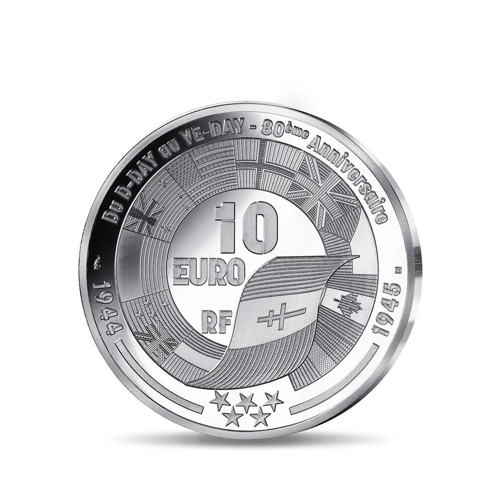 Außer den soeben erwähnten und beschriebenen Münzen gibt es noch eine 10-€-Münze zum gleichen Thema allerdings in 333er Silber, die rückseitig den Triumpfbogen in Paris, ein paar Friedenstauben und im Vordergrund ein V aus alliierten Flaggen zeigt und die Legende VE-DAY 1939–1945 / 80 ANS / 2025 nennt. Vorderseitig sehen wir einen Lorbeerzweig und einen Eichenzweig in der Form eines Euro-Symbols mit Wertangabe innerhalb eines Sechsecks und lesen die Umschrift REPUBLIQUE FRANCAISE.