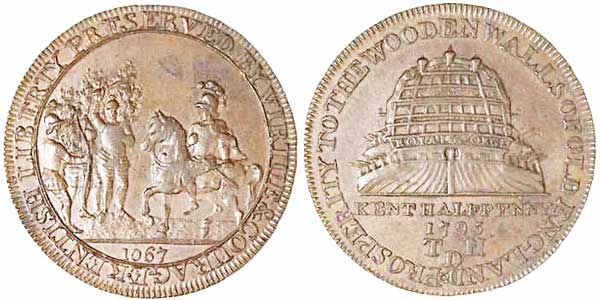 Das Motiv der Vorderseite bezieht sich auf eine Legende, nach der sich Wilhelm der Eroberer mit Männern aus Kent getroffen hatte, die die Vorhut in der Armee von Harald II. gebildet hatten. Er sicherte ihnen zu, daß sie alle bisherigen Vorrechte und Privilegien behalten sollten. Die Formulierung THE WOODEN WALLS OF OLD ENGLAND ist auf englischen Token des späten 18. Jahrhunderts häufig anzutreffen. Damit ist die englische Flotte gemeint.