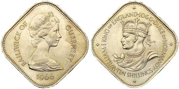 Allerdings gibt es doch eine Münze auf den 900. Jahrestag der Schlacht. Es ist eine 10-Shillings-Klippe 1966 der Vogtei Guernsey (Bailiwick of Guernsey). Sie gehört zu den Kanalinseln, die staatsrechtlich nicht zu Großbritannien gehören, sondern Kronbesitz sind. Deshalb sind sie auch nicht Mitglied der Europäischen Union.