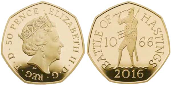 Anders ist die numismatische Sachlage im Jahr 2016 zum 950. Jahrestag der Schlacht von Hastings. Da gibt es motivgleiche britische Gedenkmünzen in Kupfernickel, Silber und Gold, die alle die Nominalangabe 50 Pence aufweisen.