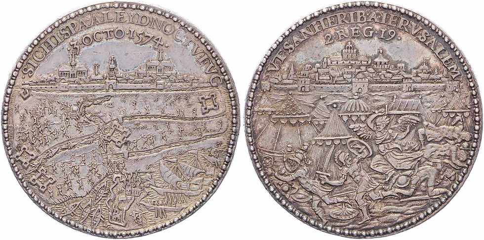 1574 Leiden ontzet. Gezicht op Jerusalem, op de voorgrond vlucht van Sanherib. / Gezicht op Leiden en de vlucht van de Spanjaarden met op de voorgrond de brandende schans van Zoeterwoude.