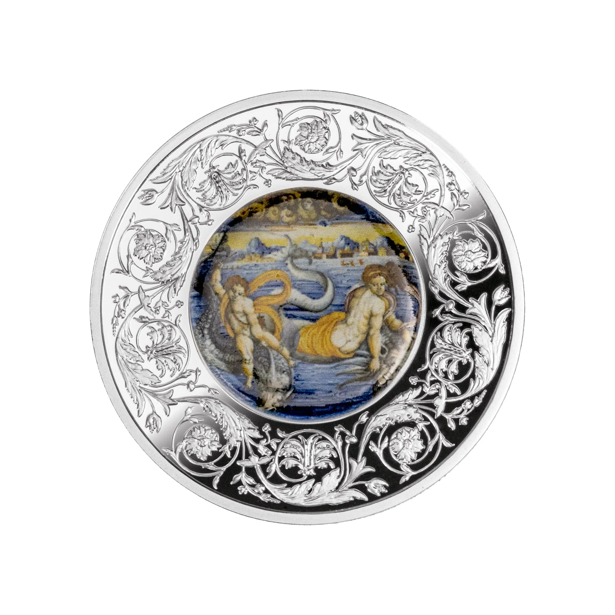 Die Münze zeigt auf ihrer Rückseite im Zentrum ein Porzellanmedaillon im Maiolica-Stil, das Venus und Cupido auf Delphinen schwimmend darstellt. Die Porzellan-Applikation in Form eines Medaillons stammt von der berühmten Porellanfabrik in Cmielów. Umgeben wird das Medaillon von einem dekorativen Ring, der Teil der beprägten Münzrückseite ist. Auf der Vorderseite finden wir das Wappen der Zentralbank von Malta mit der Legende MALTA / 2025 / 5 EURO.