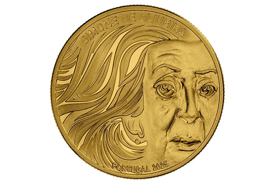 Auf Simone de Oliveira emittierte Portugal im Juli 2025 eine 5-€-Münze in den Metallvarianten Kupfernickel, Sterlingsilber und Feingold. Die Münzen sind Teil der Serie „Portugiesische Musiker“. Simone de Oliveira (* 11. Februar 1938), die den Portugiesen als die ewige Diva gilt, ist Sängerin, Fernseh- und Theaterschauspielerin. Karriere als Sängerin machte sie ab dem Ende der 1950er Jahre. 1965 und 1969 vertrat sie Portugal beim Eurovision Song Contest. Bekannt wurde sie aber vor allem für ihre Chanson-, Folklore- und Pop-Aufnahmen. Bis zu Beginn der 1970er Jahre erschienen von ihr zahlreiche Singles. Während der 1970er begann zudem ihre Schauspiel- und Theaterkarriere. Von da an war sie auch in mehreren portugiesischen Telenovelas und in einigen Spielfilmen zu sehen. 2003 spielte sie beispielsweise die Alma Mahler-Werfel in der Produktion „Alma – A Show Biz ans Ende“ von Joshua Sobol. 2015, im Alter von 77 Jahren, nahm sie noch einmal am Festival da Cançao teil und kam mit ihrem Beitrag sogar ins Finale, verlor aber schließlich gegen Leonor Andrade. Ebenfalls 2015 wurde sie mit dem Großkreuz des Ordens des Infanten Dom Henrique geehrt.