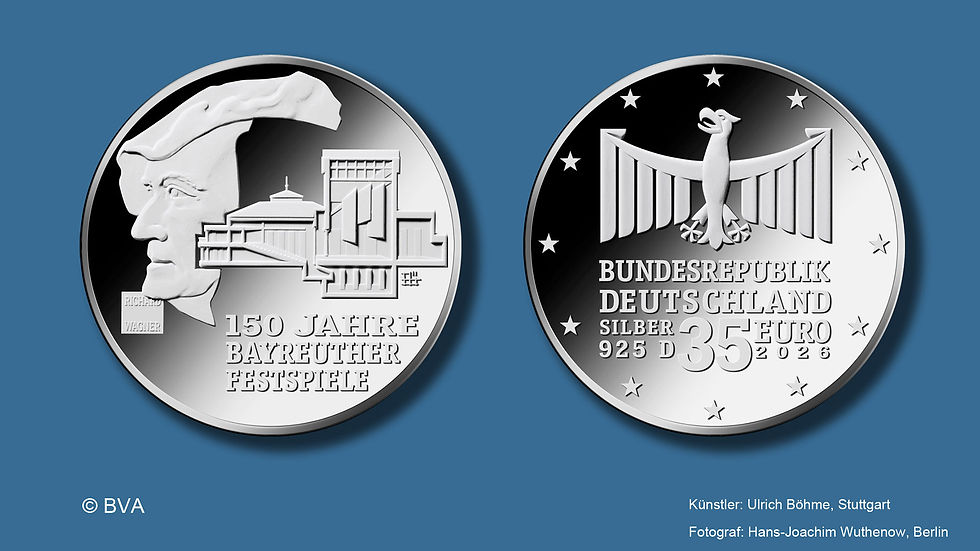 Gleich drei neue Sammlermünzen aus Deutschland werden im Heft präsentiert, zwei silberne und eine 100-Euro-Münze aus Gold. Die 35-Euro-Sammlermünze 150 Jahre Richard Wagner-Festspiele Bayreuth ist in der grafischen Gestaltung vielleicht die gelungenste. Über den Gewinner Ulrich Böhme aus Stuttgart heißt es im Protokoll der Preisgerichtssitzung: Der siegreiche Entwurf verbindet im zentralen Münzbild das Porträt Richard Wagners in leichter Dreiviertel-Ansicht gekonnt mit einem Querschnitt des Festspielhauses auf dem Grünen Hügel. Die handwerklich hervorragend ausgearbeitete Profilansicht greift auf die visionär blickende, ikonische Darstellung Wagners mit Samt-Barett zurück. Erläuternd wird dem Bildnis eine Plakette mit dem Namenszug des Komponisten beigegeben. Das dem Blick des Betrachtenden geöffnete Festspielhaus besticht nicht nur durch seinen hohen Grad an Detailtiefe, sondern auch durch die Idee, eine architektonische Schnittzeichnung des gesamten Festspielhauses mit Zuschauersaal, Bühnenturm, legendärem Bayreuther Klang-Raum-Orchestergraben und Hinterbühne abzubilden. Die moderne Komposition aus Porträt und Architektur ruht auf einem monumentalen Schriftsockel, der in serifenbetonterSchrift den Ausgabeanlass nennt. Die mit der Bildseite vortrefflich harmonisierende Wertseite greift die Monumentalität durch die blockhafte Anordnung der Aufschriften auf. Über dem Schriftbild thront mit aufgespanntem, vorhanggleichem Federkleid ein würdevoller Adler, der in seiner vertikalen Ausrichtung auf den Gebäudequerschnitt der Bildseite antwortet. Angesichts der immer wiederkehrenden Kritik an den Münzbildern sowie dem jüngsten Theater um Nennwert und Legierung der deutschen Silbermünzen ist diese Münze immerhin ein echter Lichtblick!