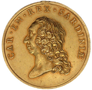 Goldmedaille zu 10 Dukaten 1755, Turin. Geprägt vermutlich als Donativ anlässlich der Feierlichkeiten zu seinem 25-jährigen Regierungsjubiläum. 40 mm; 35,78 g.
