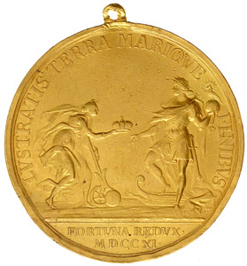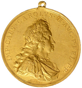 315, Große Goldmedaille im Gewicht von 40 Dukaten 1711, v. Bengt (Benedict) Richter. a.s. Kaiserkrönung in Frankfurt am Main. IMP . CAES . CAROLVS . VI. AVG. P . FEL . P . P. Geharnischtes, belorbeertes Brustbild n. r., darunter der Name des Stempelschneiders/LVSTRATIS TERRA MARIQVE – FINIBVS Fortuna mit Steuerruder, Glücksrad und Erdhalbkugel reicht dem Kaiser, der antik gewandet an Land steht und seinen Fuss auf eine Prora stellt, die Krone, im Abschnitt FORTVNA REDVX / MDCCXI. 139,27 g. Mit Trageöse.