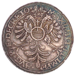 2266, Dicker doppelter Reichstaler 1572 mit Titel Maximilians II. MO NO - AR - CI - - C - OLON Greif und Löwe halten den behelmten Stadtschild, oben zu den Seiten die geteilte Jahreszahl 15 - 7Z// MAXIMILI I - I IMPE - AVG P - F DECRETO * Gekrönter Doppeladler, auf der Brust Reichsapfel. 58,34 g.