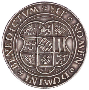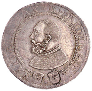 2435, 1 1/2 Taler 1527, Annaberg. Brustbild n. l. mit Haube in doppeltem Schriftkreis/10feldiges, unbehelmtes Wappen. 43,23 g.