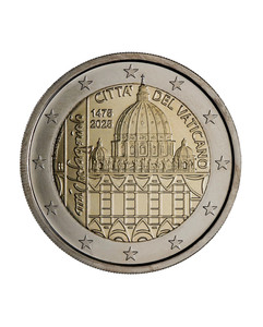 Die nationale Seite der 2-€-Münze ist zweigeteilt und zeigt in der oberen Bildhälfte die imposante von Michelangelo entworfene Kuppel des St. Peters Doms und in der unteren die Deckenstruktur der Sixtinischen Kapelle, die Michelangelo im päpstlichen Auftrag mit einem gewaltigen biblischen Freskenzyklus aumalte. Die Legende lautet CITTA´ DEL VATICANO / michelangelo / 1475 / 2025.