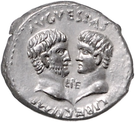 Röm. Republik, Marc Anton und M. Barbatus Pollio. Denar (41 v. Chr.), Athen. Dunkle Patina, kleiner Schrötlingsriss, sehr Schön bis Vorzüglich. Schätzpreis: 1.600,00 Euro