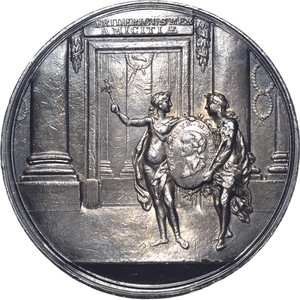 Katharina II. 1762-1796. Silbermedaille 1776, (unsigniert, Loos oder Abramson). Auf den Besuch des Großfürsten Paul von Russland in Berlin. Vor Portal stehen zwei Genien mit dem Bildnis des Großfürsten / 3 Zeilen Schrift im Lorbeerkranz, darunter 4 Zeilen. 42,50 mm, 27,94 g. Diakov 173.2 (R) Slg. Marienburg 3202 Slg. Henckel - Olding 694 Sommer A 3 Seltenes und attraktives Exemplar.