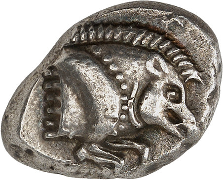 Nr. 32: Ekuwemi. Stater, 480-460, unbestimmte Münzstätte. Sehr selten. Herrliche Patina. Gutes sehr schön. Taxe: 1.000 Euro.