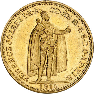 Nr. 6099: 20 Kronen 1916, Kremnitz. Mit bosnischem Wappen. Selten. Vorzüglich. Taxe: 2.500 Euro.